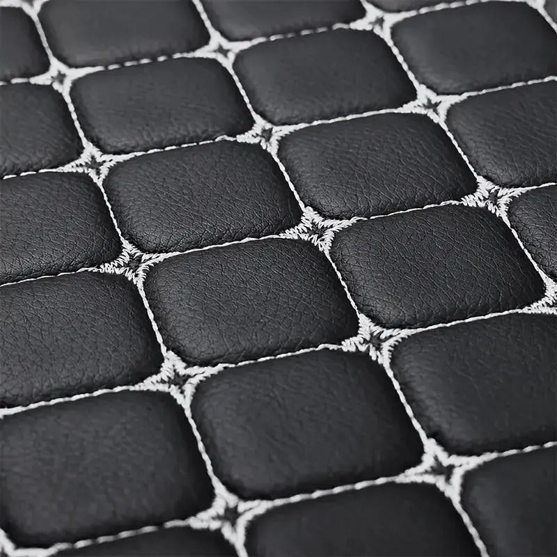 Beyaz kapitone dikiş, siyah deri yüzeyle birleştiğinde sade, premium ve göz alıcı bir kontrast oluşturur; hem estetik hem fonksiyonel bir kullanım sunar.