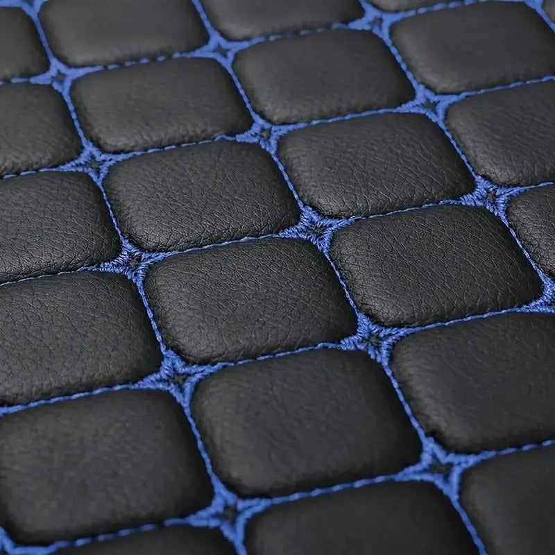 Mavi kapitone dikiş, siyah deri yüzeyle birleştiğinde canlı ve dinamik bir kontrast oluşturur; hem estetik hem fonksiyonel bir kullanım sunar.